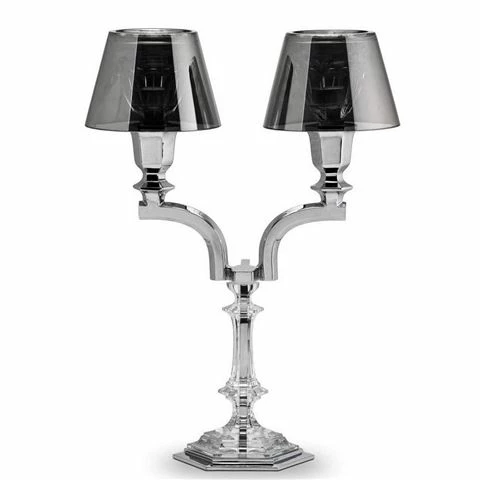 The Baccarat Harcourt Our Fire 2 Arms Candelabra is made from crystal, and combines a timeless appeal, sleek silvered finishes, and features a lampshade design.