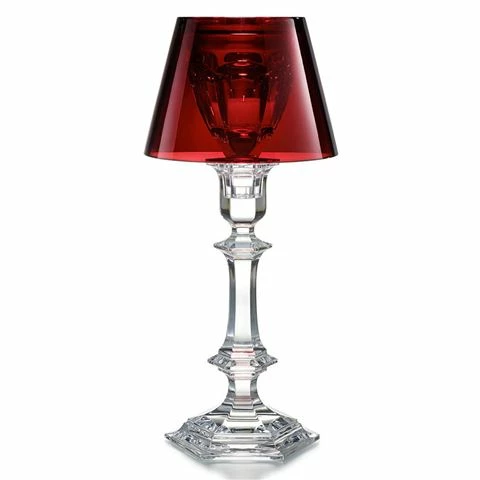 The candle holder is made up of three sections: the base is a Harcourt candlestick, followed by a candleholder inspired by the form of Baccarat’s Harcourt glass, and finally a crystal lampshade with a glittering red metallic finish. Light, filtered by the magic of crystal, flickers from the flame of the candle and turns into a magic glow.