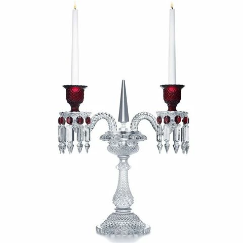 The Zénith Candelabra Clear and Red is made from crystal, and is luminously draped with geometrically cut crystal shapes in a clear and red colour finish.