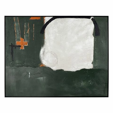 Deep, dark, moody greens embossed with earthy texture are interrupted by layers of light in this dramatic abstract oil. The eye is drawn to bursts of ginger and a bold layering of shape and form creating a composition that is modern and interpretive. Finished in a matte black shadow box frame, Field of Greens makes a substantial statement at 140 x 110cm.