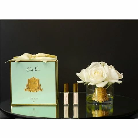 These beautiful roses are handcrafted with a natural coating to give a life like touch and appearance. The petals are infused with a fine fragrance, and accompanied with two fragrance sprays of Rose Petal and Charente Rose to refresh and enhance their perfume. The blooms are set in gel and housed within a glass vase with golden crest. It is then beautifully presented in a Jade Tiffany Blue ribboned box.