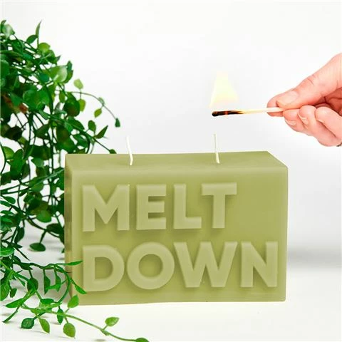 - Embellished with the words Melt Down carved into the soft green wax.