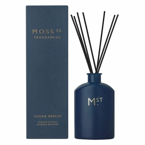 The Moss St. Ocean Breeze Scented Diffuser is a refreshingly smooth, aquatic fragrance. It has top notes of bergamot and peppermint, heart notes of moss, geranium and neroli with base notes of amber, musk and tobacco.