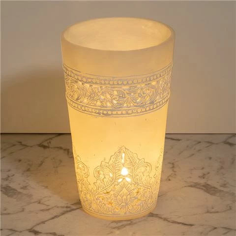 The Casablanca Hurricane White by Papaya is made from lace-cut stone-resin. Featuring a delicate floral design growing from the tapered base and a band at the top, the Casablanca Hurricane White comes with an LED tealight and a glass candle insert.Â
